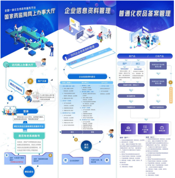 答:较之前旧备案信息管理系统直接在系统上完成账号注册和产品备案操作不同,今年5月1日起启用的化妆品注册备案平台使用需进行三个步骤:1、访问国家药监局网上办事大厅注册法人账号和/或经办人账号;2、访问企业信息资料管理系统,申办注册人/备案人、境内责任人、生产企业角色权限。3、访问普通化妆品备案管理系统进行新产品备案、已有产品补录、备案变更、备案注销及产品年度报告。
