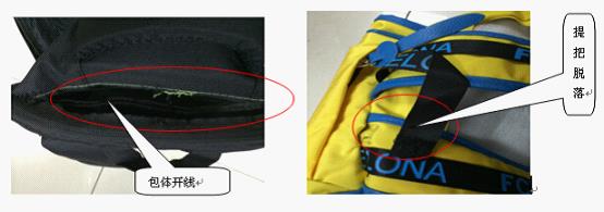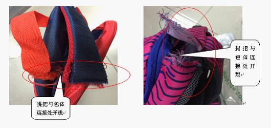 1.在执行标准为QB/T1333-2010的书包中,只有近三成具有较好的振荡冲击性能。28批次书包样品在标准规定的负重条件下进行振荡冲击性能试验,测试结果显示,约七成样品在测试后出现包体开线,提把脱落、提把与包体连接处开线、提把与包体连接处开裂等现象,影响消费者的正常使用。