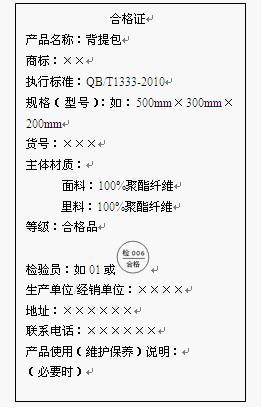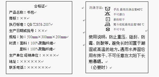 4.大部分书包样品的标志标注完整。作为产品质量的一部分,标志、标签是引导消费者购买商品的重要参照因素之一。正确完善的标志可以帮助消费者做出正确的选择,反之则会对消费者造成误导,使消费者在购买产品时不能明确识别产品的基本信息与优劣程度。本次比较试验的70款样品中,有17款样品的标志标注不完善,出现未标注生产日期及批号、执行标准编号、生产单位地址、联系电话、货号、规格(型号)、等级、货号、主体材质(面料、里料)等情况。图5为学生书袋标志标签正确标注示例,图6为背提包正确标注标志标签示例。
