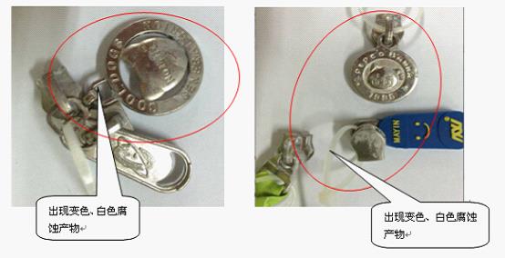 2.近七成书包样品有较好的电镀配件耐腐蚀性。本次比较试验中有42款书包样品按标准要求测试了电镀配件耐腐蚀性。电镀配件是考核书包上五金配件的抗腐蚀性能。五金配件在书包上的运用,兼有功能性和装饰性,但质量较差的五金配件,往往耐腐蚀性表现不佳,常会出现生锈等质量问题。电镀配件的耐腐蚀性是用等级来表示,等级越高,其抗腐蚀性能越好。经测试,在标称执行标准为QB/T2858-2007的42款书包中,约三成书包样品的耐腐蚀性能与标准值存在差异。图3是电镀配件腐蚀示例。