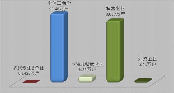 在其他类型的市场主体中,个体工商户99.4万户、农民专业合作社1428户,同比分别增长8.75%、4.77%,分别占总量的49.67%、0.07%(详见图3)。