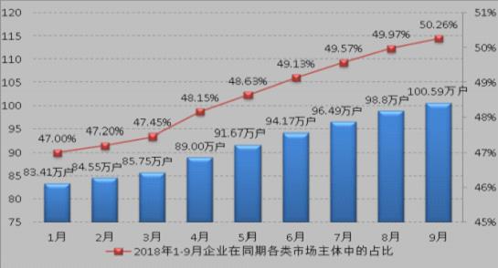 (一)各类市场主体和企业占比实现历史性突破。今年前三季度,我市期末实有各类市场主体总数保持持续稳定增长,连破180万户、190万户大关,截至2018年9月末,全市实有各类市场主体户数首次突破200万户,达200.13万户,同比增长19.05%(详见图1及附件1)。其中,实有企业数100.59万户,首次突破100万户,同比增长31.29%,企业在各类市场主体中的占比首次过半,达50.26%(详见图2),达到历史新高。全市每千人拥有企业72户,较去年同期55户增加17户。