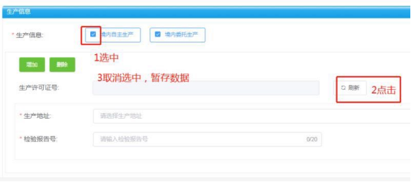 答:确认企业信息已变更通过的情况下:1、勾选中“生产信息”栏里的“境内自主生产”;2、点击“刷新”;3、取消步骤1选中,暂存数据,详见图解。