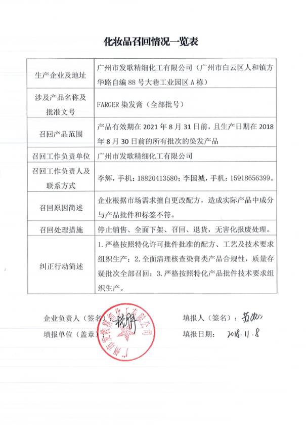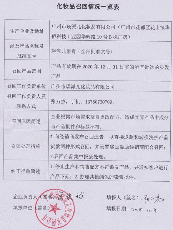 广州市瑛派儿化妆品有限公司、广州歌秀化妆品有限公司、广州市发歌精细化工有限公司3家化妆品生产企业因生产不合格化妆品被原国家食品药品监督管理局通报。上述企业已对不合格产品实施了主动召回,但仍有部分存在安全隐患的产品无法完成召回。经企业排查并报告我局,决定对存在安全隐患的产品实施全面召回。现将有关产品信息予以通告,具体内容详见附件:《化妆品召回情况一览表》。
